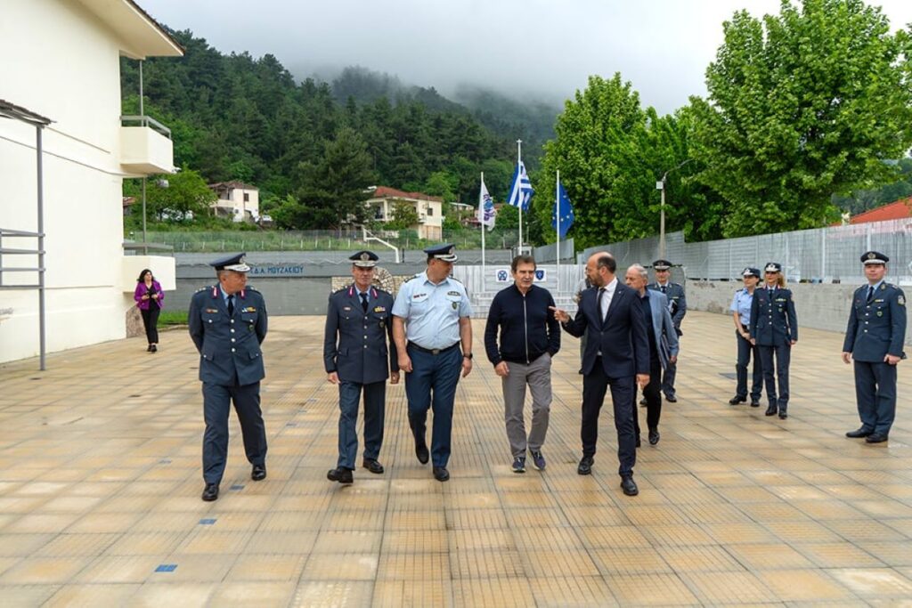 Πριν το τέλος της επίσκεψης, η οποία έγινε σε ένα πολύ θερμό κλίμα, ο Υπουργός κ. Χρυσοχοΐδης μετέβη στη Σχολή Δοκίμων Αστυφυλάκων Μουζακίου, συνοδευόμενος από το Δήμαρχο κ. Στάθη και τον Διοικητή της Σχολής κ. Ιωάννη Τσιώλη, και δήλωσε ιδιαίτερα ικανοποιημένος με τις εγκαταστάσεις. Εκεί ο κ. Στάθης έκανε προτάσεις για την περαιτέρω αναβάθμιση της Σχολής.