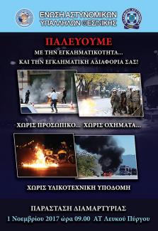 Η Ένωση Αστυνομικών Υπαλλήλων Θεσσαλονίκης αποφάσισε την πραγματοποίηση παράστασης διαμαρτυρίας έξωθεν του Α.Τ. Λευκού Πύργου την Τετάρτη 01-11-2017 και ώρα 09.00.