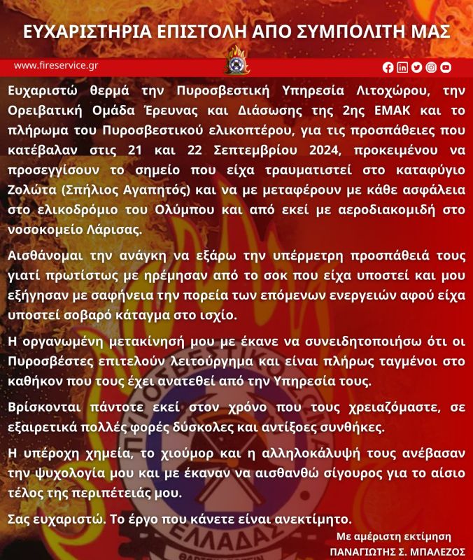 «Ευχαριστώ θερμά την Πυροσβεστική Υπηρεσία Λιτοχώρου, την Ορειβατική Ομάδα Έρευνας και Διάσωσης της 2ης ΕΜΑΚ και το πλήρωμα του Πυροσβεστικού ελικοπτέρου, για τις προσπάθειες που κατέβαλαν στις 21 και 22 Σεπτεμβρίου 2024, προκειμένου να προσεγγίσουν το σημείο που είχα τραυματιστεί στο καταφύγιο Ζολώτα (Σπήλιος Αγαπητός) και να με μεταφέρουν με κάθε ασφάλεια στο ελικοδρόμιο του Ολύμπου και από εκεί με αεροδιακομιδή στο νοσοκομείο Λάρισας.