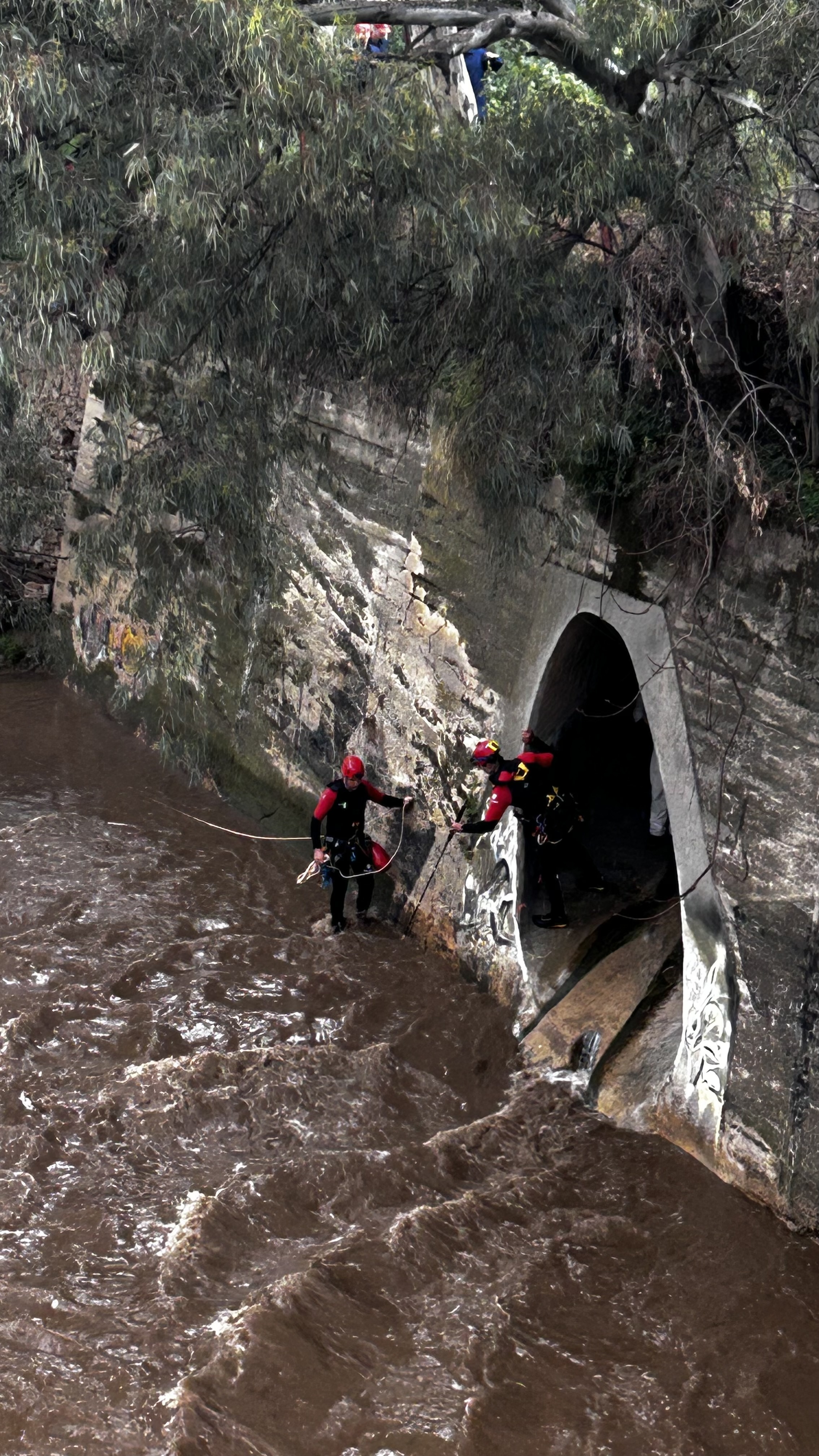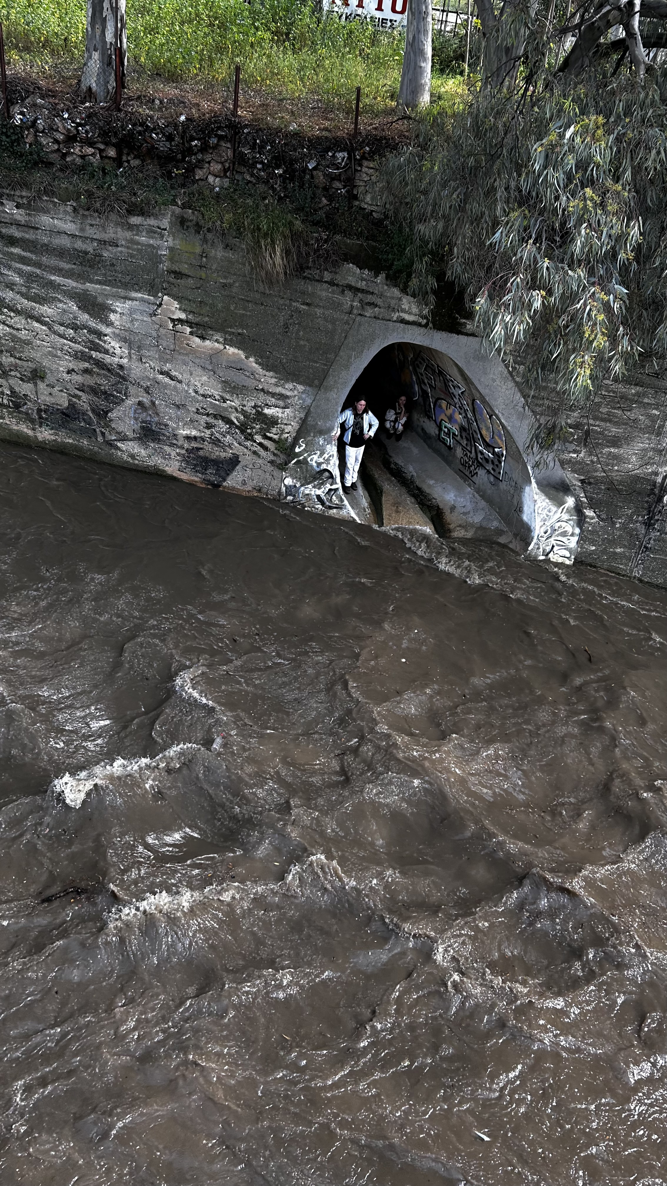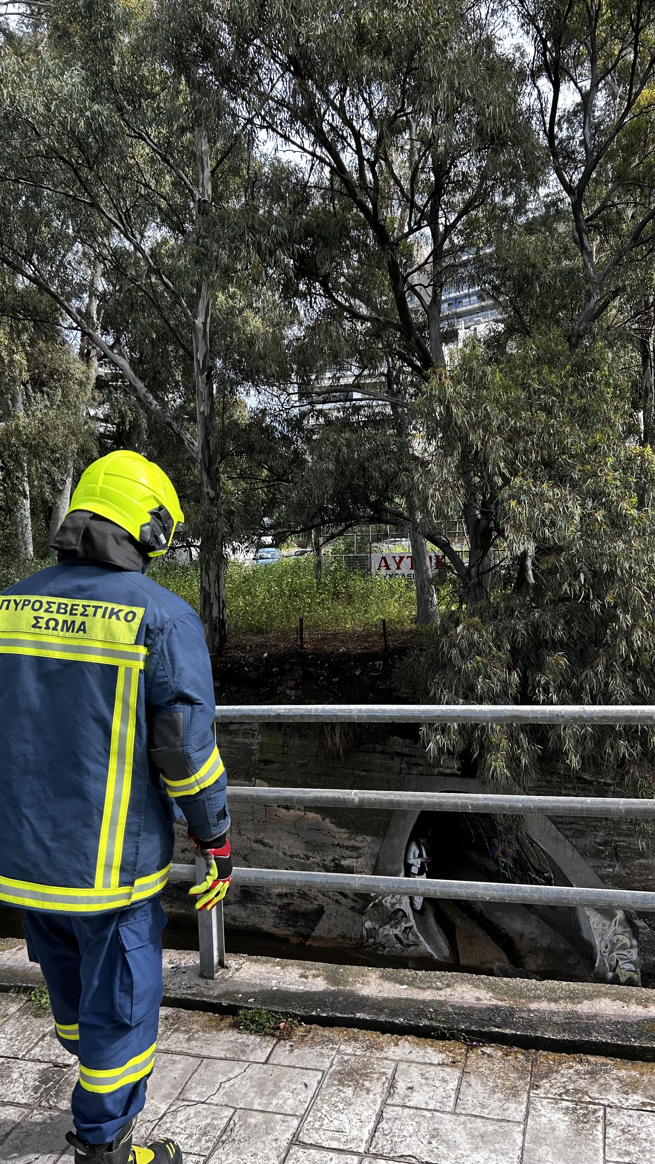 Παρατηρώντας τον χώρο εντόπισε δυο άτομα να έχουν εγκλωβιστεί στο ρέμα με τα νερά να διέρχονται ορμητικά λόγω της έντονης βροχόπτωσης.