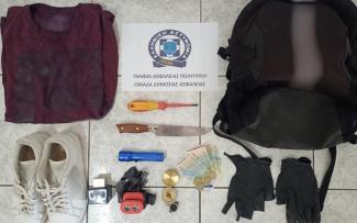 Ο ημεδαπός άνδρας συνελήφθη από προστρέξαντες αστυνομικούς και στη κατοχή του βρέθηκαν και κατασχέθηκαν, μεταξύ άλλων, ένα μαχαίρι, ένα κατσαβίδι, 2 φακοί, πυξίδα, γάντια, διάφορα ρούχα κ.α, καθώς και μικρό χρηματικό ποσό.