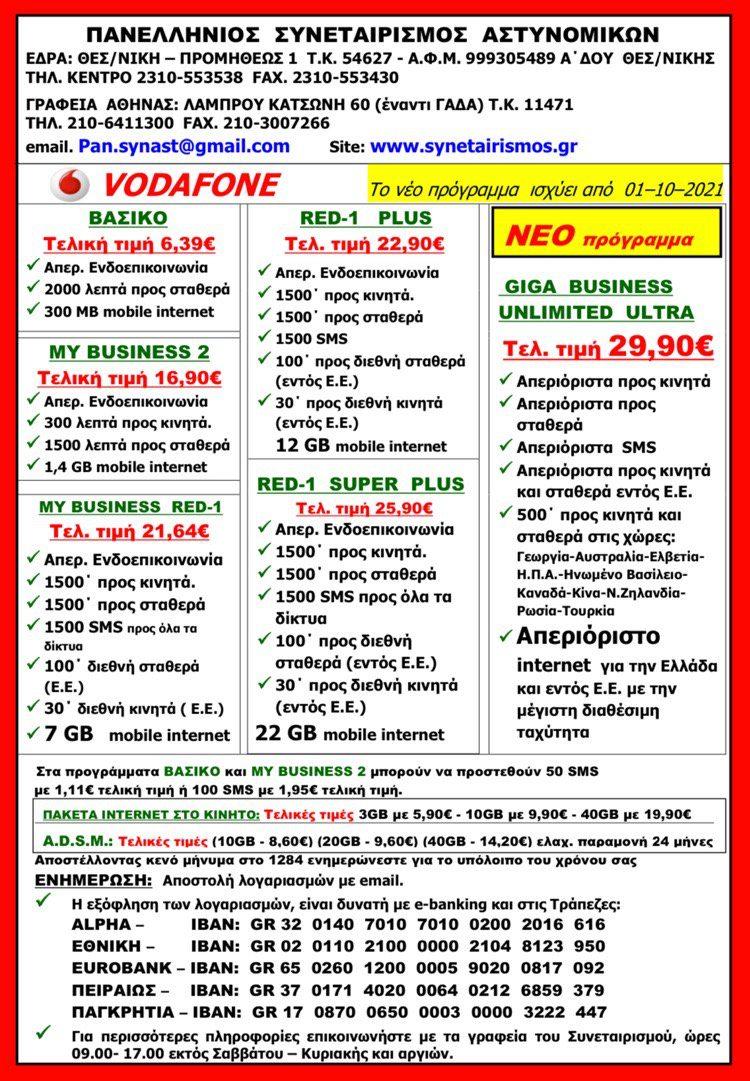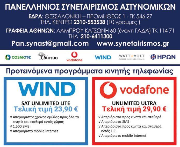 Εικόνα 23:26 | 16/06/2022 Ο Πανελλήνιος Συνεταιρισμός Αστυνομικών εξασφάλισε τα παρακάτω πακέτα κινητής τηλεφωνίας: Εικόνα Εικόνα Διαβάστε επίσης Σύλληψη 48χρονου στο πλαίσιο Ευρωπαϊκού Εντάλματος για φοροδιαφυγή στη Γερμανία Εικόνα ΠΑΝΕΛΛΗΝΙΟΣ ΣΥΝΕΤΑΙΡΙΣΜΟΣ ΑΣΤΥΝΟΜΙΚΩΝ