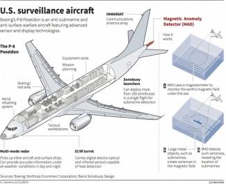 Το P-8 Poseidon, το πιο προηγμένο ανθυποβρυχιακό αεροσκάφος στον κόσμο, χρησιμοποιείται από το Αμερικανικό Ναυτικό εδώ και ένα μόλις χρόνο. Ουσιαστικά είναι ένα τροποποιημένο Boeing 737, προσαρμοσμένο για υποβρύχιες έρευνες. Αυτό το σχεδιάγραμμα αποτυπώνει τις δυνατότητες του P-8 Poseidon να ανιχνεύει εχθρικά υποβρύχια, πλοία επιφανείας, και άλλα αεροσκάφη.
