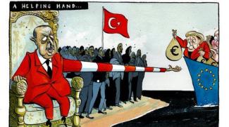 Ο πρόεδρος της Τουρκίας Ρετζέπ Ταγίπ Ερντογάν κάθεται επάνω σε θρόνο και γεμάτος άνεση και αυτοπεποίθηση απλώνει το μακρύ του χέρι, «το χέρι βοηθείας», που σημειώνει και το σκίτσο προς το καράβι της Ευρωπαϊκής Ενωσης, που βρίσκονται οι Ευρωπαίοι ηγέτες.