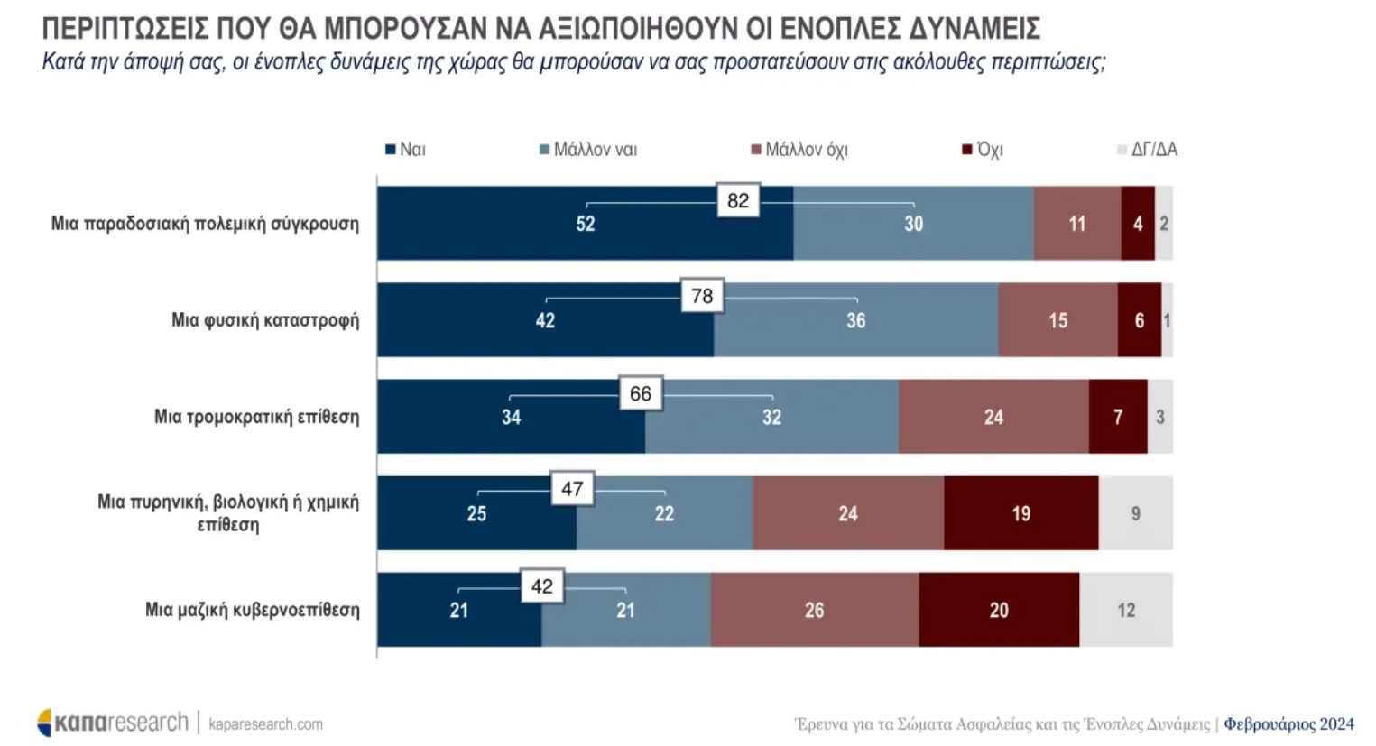 Παράλληλα, ρωτήθηκαν για τις περιπτώσεις που θα μπορούσαν να αξιοποιηθούν οι Ένοπλες Δυνάμεις, με το μεγαλύτερο μέρος να συμφωνεί ότι η συμβολή τους θα ήταν χρήσιμη σε μία παραδοσιακή πολεμική σύγκρουση ή μία φυσική καταστροφή.