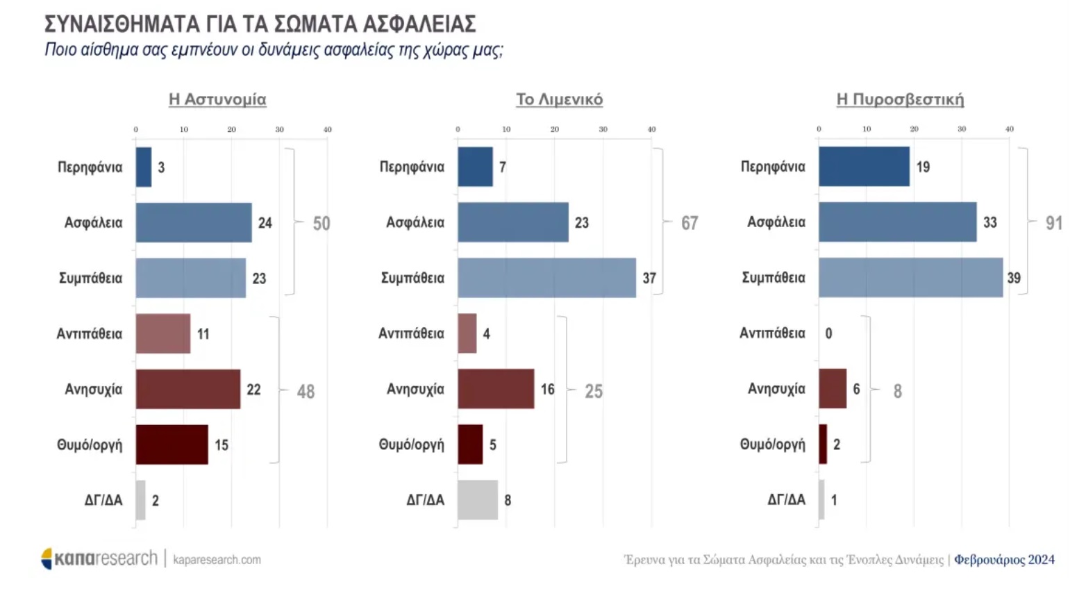 Οι ερωτηθέντες κλήθηκαν να απαντήσουν και για το τι είδους συναισθήματα τους εμπνέουν οι δυνάμεις ασφαλείας της χώρας όσον αφορά την περηφάνια, συμπάθεια, ασφάλεια, αντιπάθεια, ανησυχία, θυμό και την οργή.