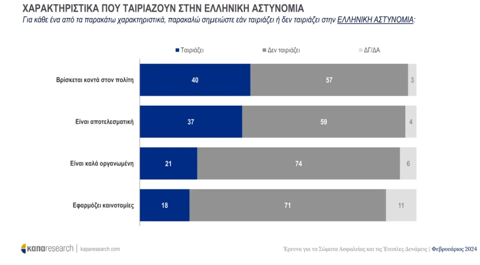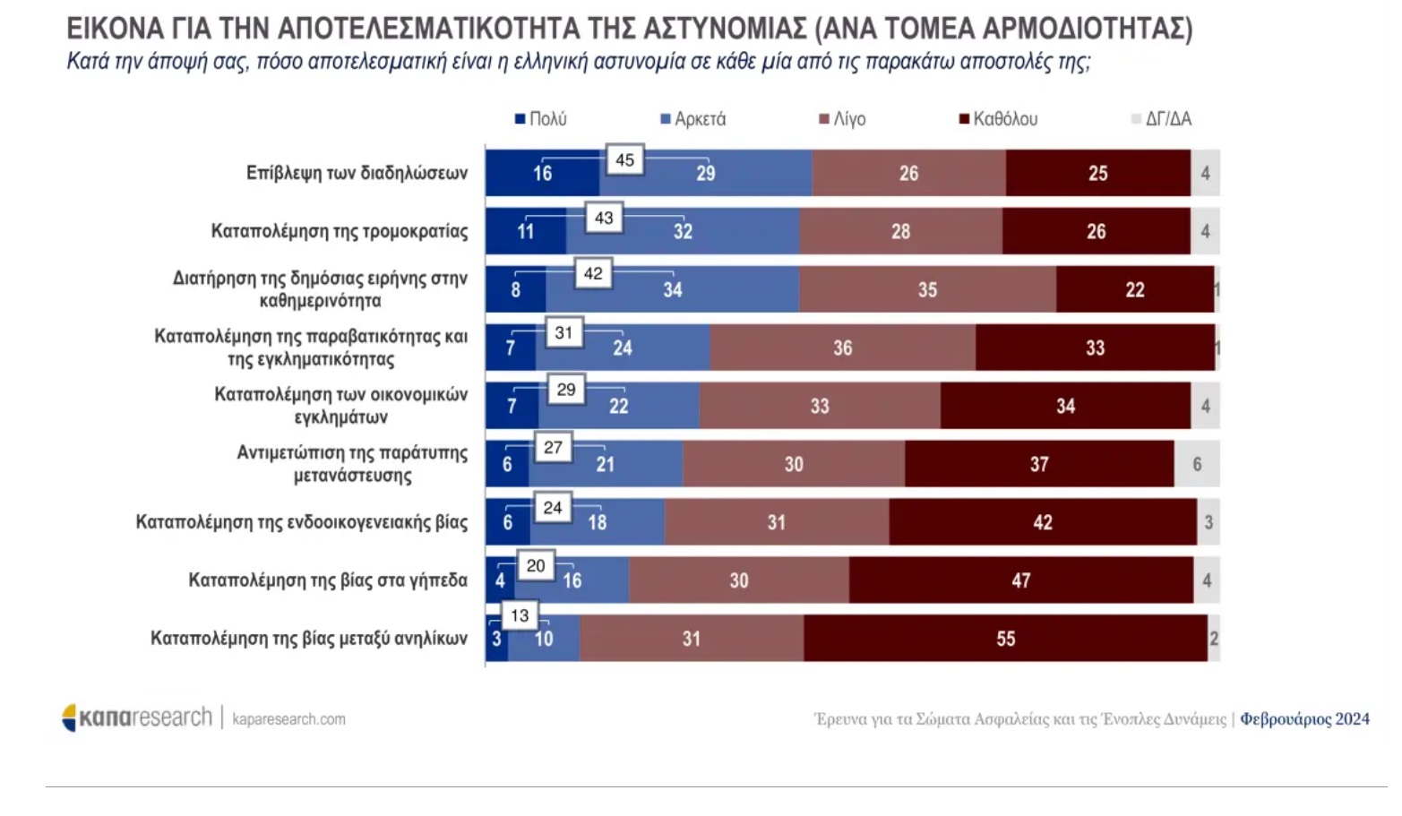 Όσον αφορά την Ελληνική Αστυνομία, το 47% θεωρεί ότι οι αστυνομικοί βρίσκονται κοντά στον πολίτη, ενώ σε ερώτηση σχετικά με την αποτελεσματικότητα της δράσης του, το 59% θεωρεί ότι είναι αναποτελεσματική.