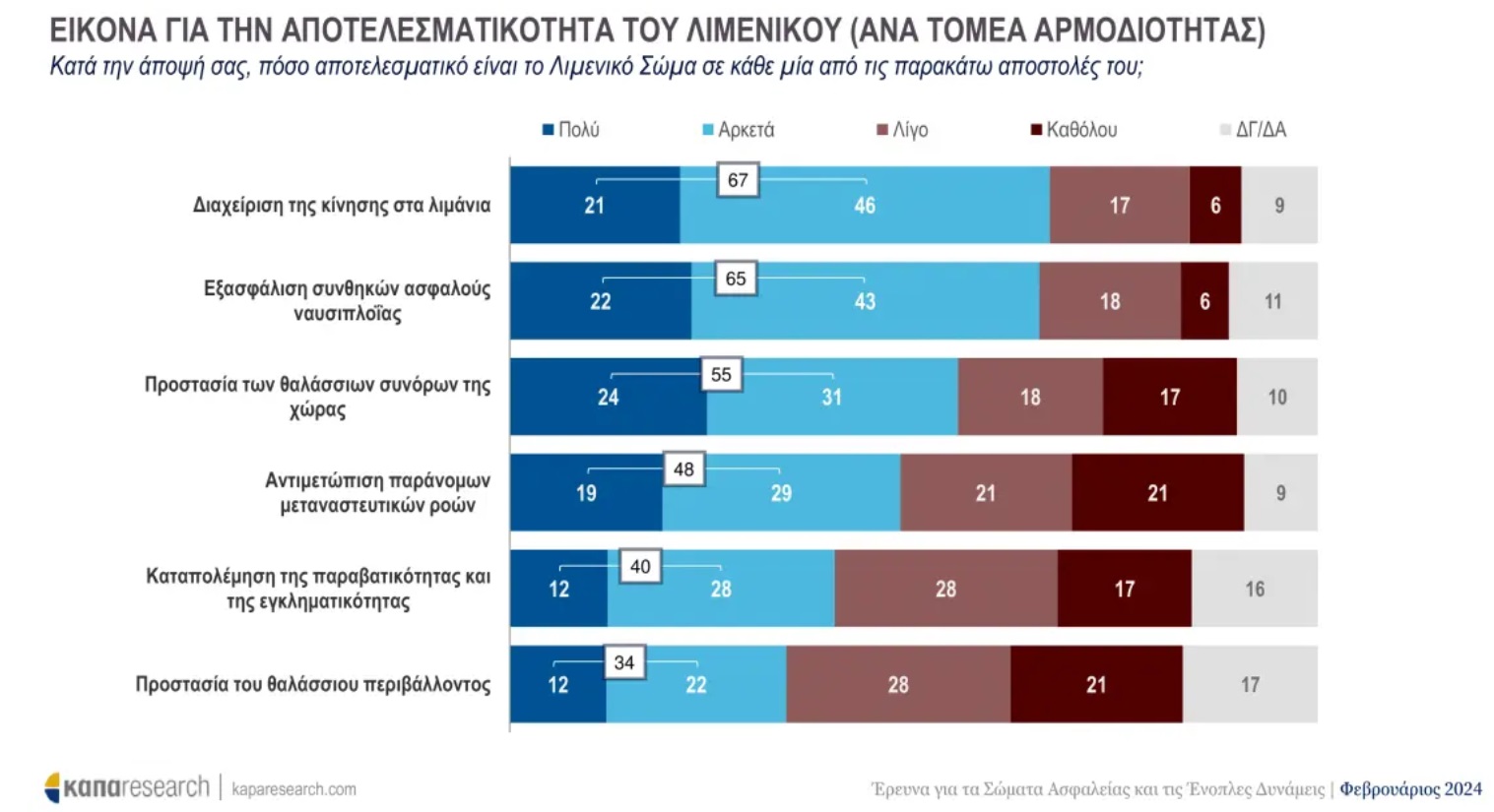 Σε επόμενη ενότητα της έρευνας, πάνω από το 65% του δείγματος της έρευνας θεωρεί ότι το Λιμενικό Σώμα είναι αποτελεσματικό στη διαχείριση της κίνησης στα λιμάνια και την εξασφάλιση των συνθηκών ασφαλούς ναυσιπλοΐας.