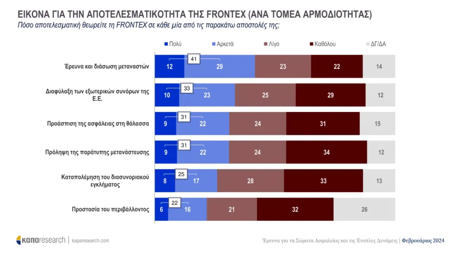 Παράλληλα, πραγματοποιήθηκαν ερωτήσεις για την αποτελεσματικότητα της Frontex, του Οργανισμού Ευρωπαϊκής Συνοριακής και Ακτοφυλακής. Από την έρευνα αποτυπώθηκε ότι το 41% από το δείγμα της έρευνας θεωρεί ότι η Frontex είναι αποτελεσματική στην έρευνα και τη διάσωση των μεταναστών, ενώ λιγότεροι συμφώνησαν ότι είναι αποτελεσματική στη διαφύλαξη των εξωτερικών συνόρων της Ευρωπαϊκής Ένωσης.