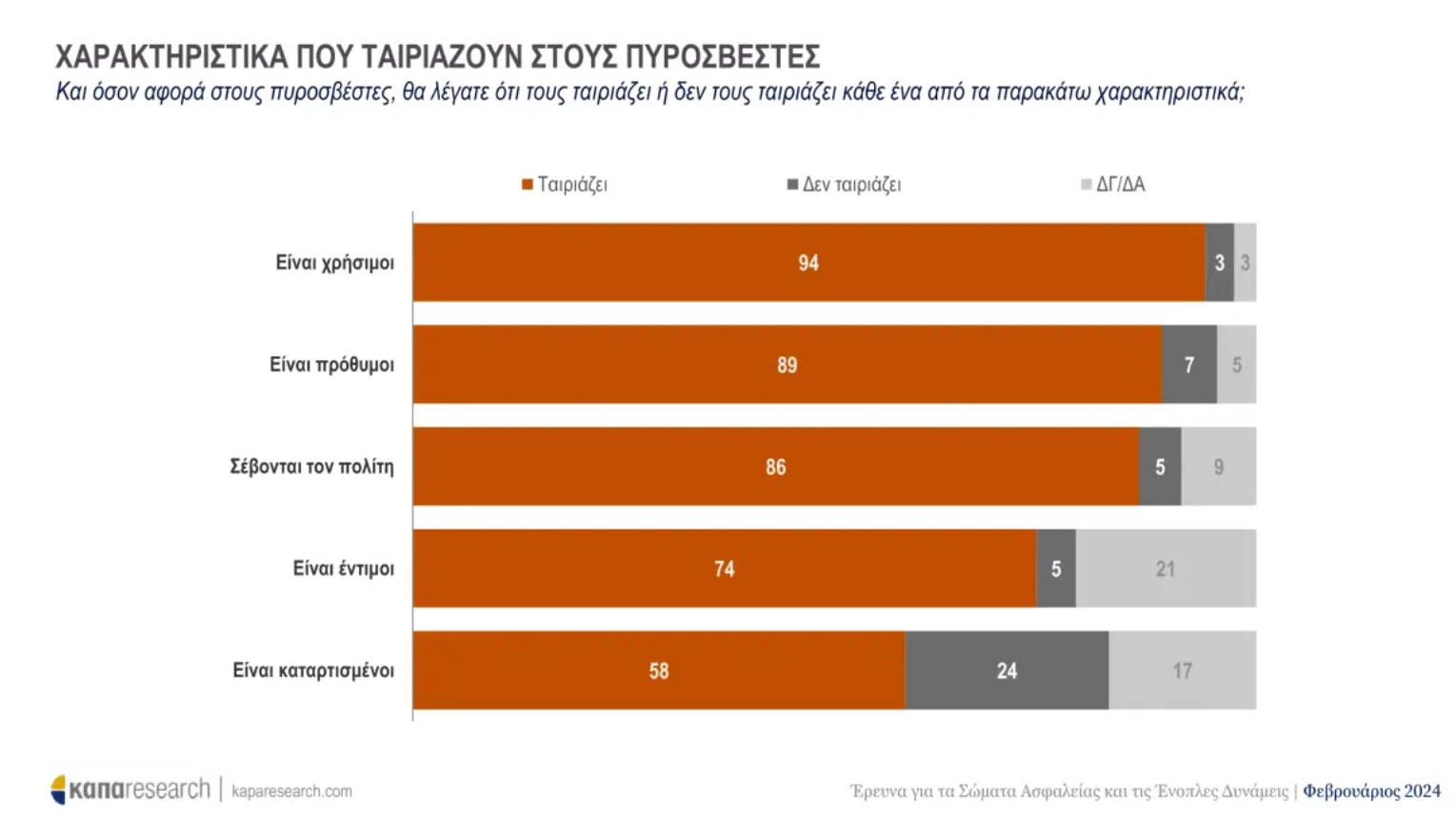 Παράλληλα, το Πυροσβεστικό Σώμα φαίνεται να συγκεντρώνει την πιο θετική εικόνα στα Σώματα Ασφαλείας, με τους ερωτηθέντες να συμφωνούν κατά 86% ότι η εικόνα που έχουν σχηματίσει είναι θετική.