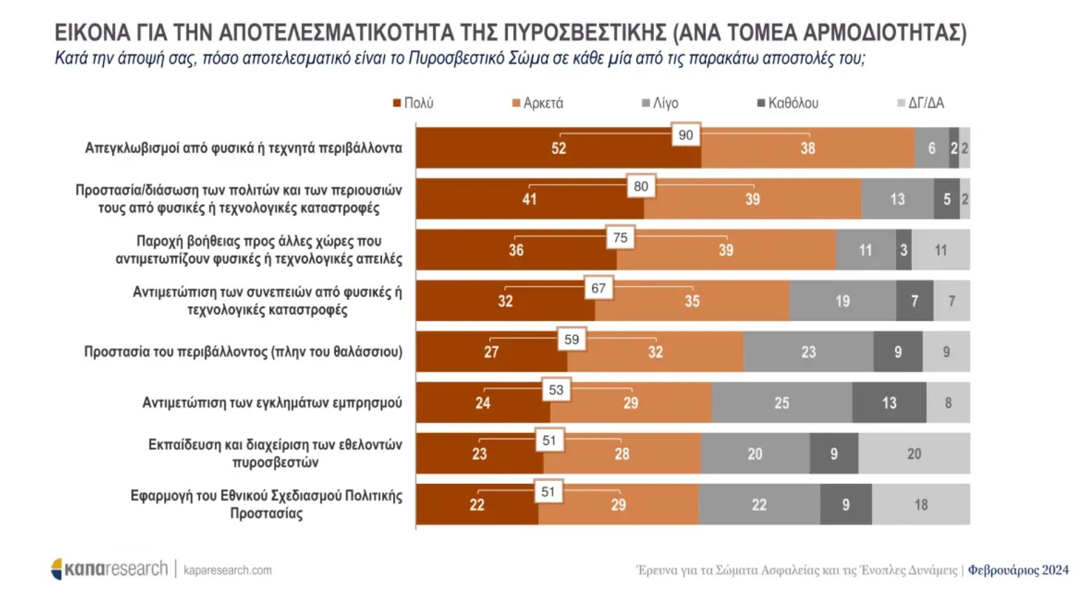Μάλιστα, σε σχέση με την αποτελεσματικότητα του Πυροσβεστικού Σώματος, το 80% του δείγματος θεωρεί ότι είναι αρκετά αποτελεσματικό στην προστασία και τη διάσωση πολιτών και των περιουσιών τους από φυσικές ή τεχνολογικές καταστροφές.