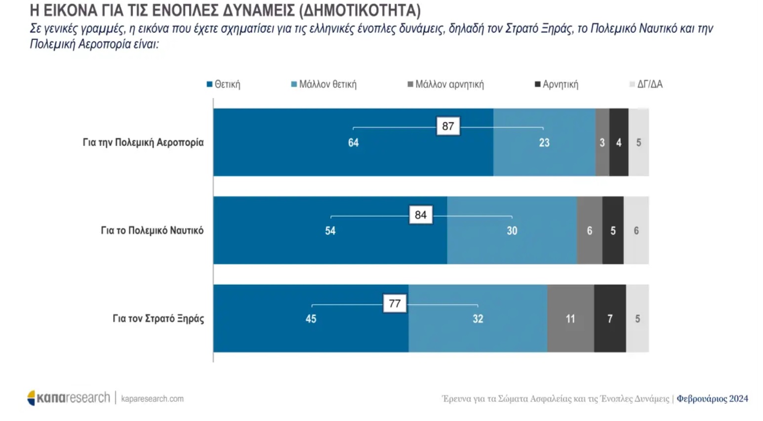 Σε άλλο μέρος της έρευνας για το αίσθημα ασφάλειας, οι πολίτες ρωτήθηκαν για την εικόνα που έχουν σχηματίσει για τις Ένοπλες Δυνάμεις, κατατάσσοντας ως πιο θετική την Πολεμική Αεροπορία, στη συνέχεια το Πολεμικό Ναυτικό και στην τρίτη θέση τον Στρατό Ξηράς.