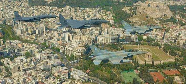 Πέμπτη, 14 Απριλίου, 2016 Σχηματισμός δύο αμερικανικών και δύο ελληνικών μαχητικών αεροσκαφών πέταξαν σε χαμηλό ύψος