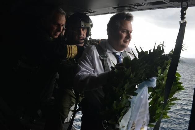 Το βίντεο είναι τραβηγμενο από το ελικόπτερο την στιγμή που ο Καμμένος ρίχνει το στεφάνι στην περιοχή που έπεσε το ελικόπτερο