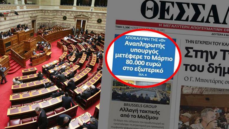 Την αποκάλυψη ότι αναπληρωτής υπουργός του ΣΥΡΙΖΑ μετέφερε τον Μάρτιο 80.000 ευρώ στο εξωτερικό κάνει σήμερα η εφημερίδα