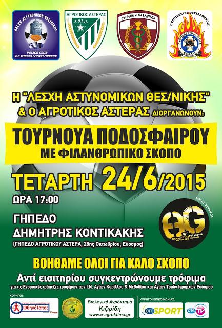 Κυριακή, 28 Ιουνίου, 2015 Η Λέσχη Αστυνομικών Θεσσαλονίκης σε συνεργασία με τον Αγροτικό Αστέρα διοργανώνουν την Τετάρτη 24 Ιουνίου 2015 και ώρα 17:00