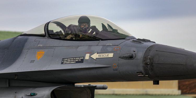 Δύο μαχητικά αεροσκάφη των ΗΠΑ, συνοδευόμενα από τέσσερα μαχητικά αεροσκάφη της ελληνικής Πολεμικής Αεροπορίας