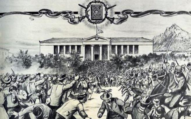 Δευτέρα, 9 Νοεμβρίου, 2015 1901: Ευαγγελικά: Βίαιες συμπλοκές ξεσπούν στο κέντρο της Αθήνας, με αφορμή τη μετάφραση του Ευαγγελίου στη δημοτική από τον