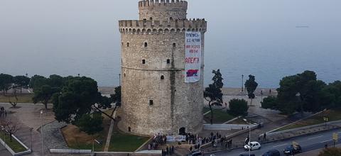 Μέλη του ΠΑΜΕ "κατέλαβαν" τον Λευκό Πύργο και κρέμασαν πανό (ΦΩΤΟ & BINTEO)