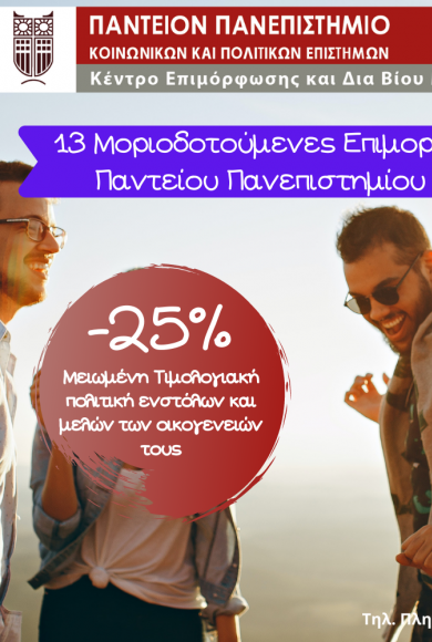 Αστυνομία -25% έκπτωση για τους ενστόλους και τα μέλη των οικογενειών τους που θέλουν να συμμετάσχουν σε επιμορφωτικά προγράμματα του Κ.Ε.ΔΙ.ΒΙ.Μ. του Παντείου Πανεπιστημίου Δευτέρα, 10 Μαΐου, 2021