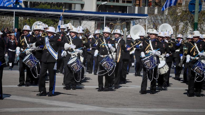Παιανίζοντας το εμβατήριο «Μακεδονία Ξακουστή» έφτασε στον χώρο του Συντάγματος η μπάντα του Πολεμικού Ναυτικού...