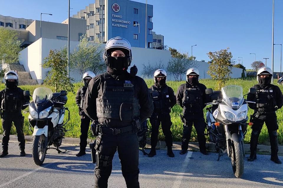 Oι αστυνομικοί της ομάδας Δ.ΙΑΣ. Πιερίας έξω από το Νοσοκομείο της Κατερίνης