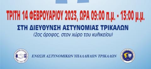 Εθελοντική αιμοδοσία της Ένωσης Αστυνομικών Τρικάλων την Πέμπτη 15/02 στη Διεύθυνση Αστυνομίας Τρικάλων.