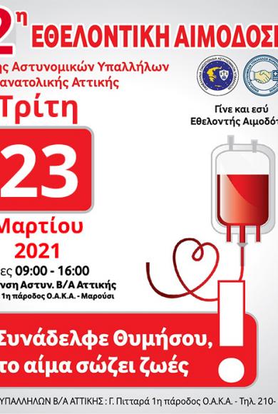 Τετάρτη, 24 Μαρτίου, 202112η Εθελοντική Αιμοδοσία της Ένωσης Αστυνομικών Υπαλλήλων Β/Α Αττικής