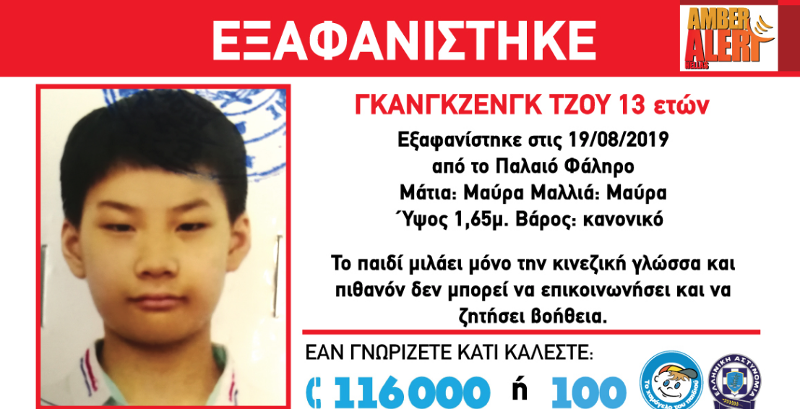 Την εξαφάνιση 13χρονου παιδιού, έξω από το σπίτι του στο Παλαιό Φάληρο στις 19/8/2019 (19:30) ανακοίνωσε το Χαμόγελο του