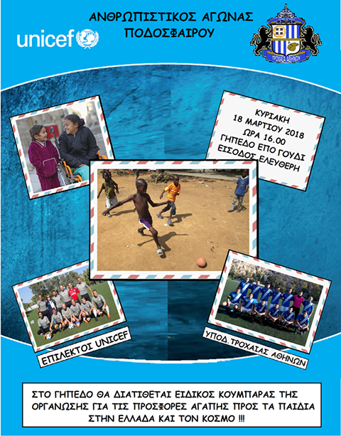 Παρασκευή, 8 Μαρτίου, 2019 Η ποδοσφαιρική ομάδα της Υποδιεύθυνσης Τροχαίας Αθηνών θα παίξει με την ομάδα Επιλέκτων Unicef.