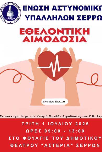 Τετάρτη, 5 Νοεμβρίου, 2025Με επιτυχία η εθελοντική αιμοδοσία της Ένωσης Αστυνομικών Σερρών
