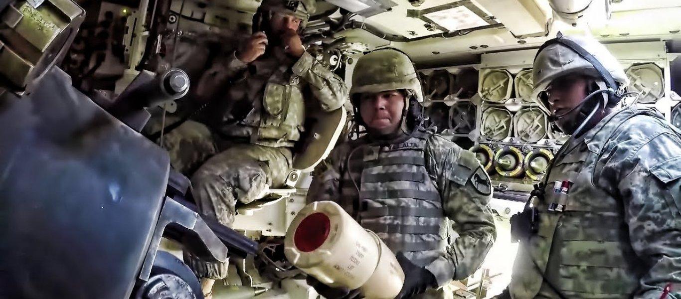 Στρατιώτες του αμερικανικού Στρατού στο Εθνικό Κέντρο Εκπαίδευσης Φορτ Ίργουιν πραγματοποιούν βολές πυροβολικού με M109A6